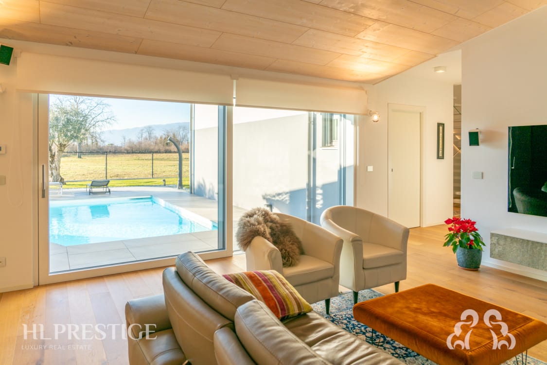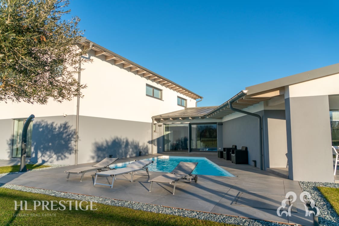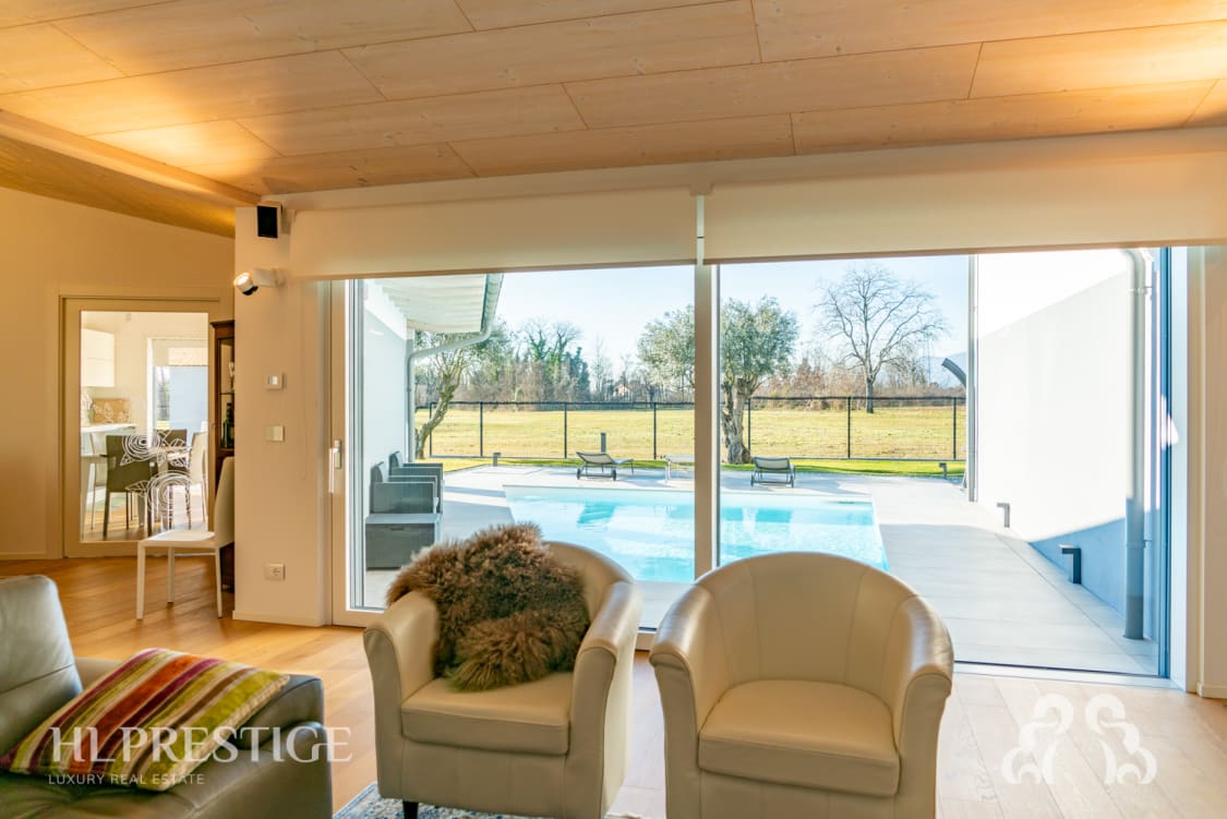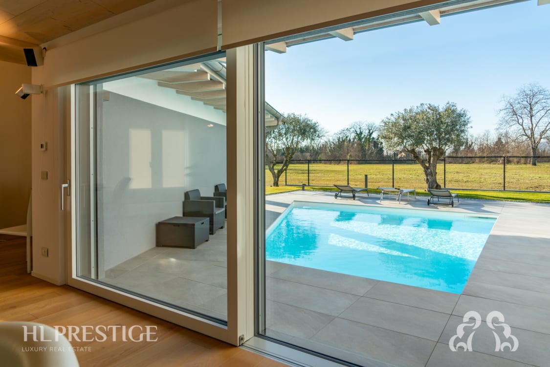 La piscina, con innovativo sistema di filtrazione senza cloro, impianto di idromassaggio e reintegro dell’acqua fornito da un pozzo artesiano con pompa sommersa, rappresenta il cuore della casa, regalando a chi vi abita momenti di relax e benessere esclusivi.