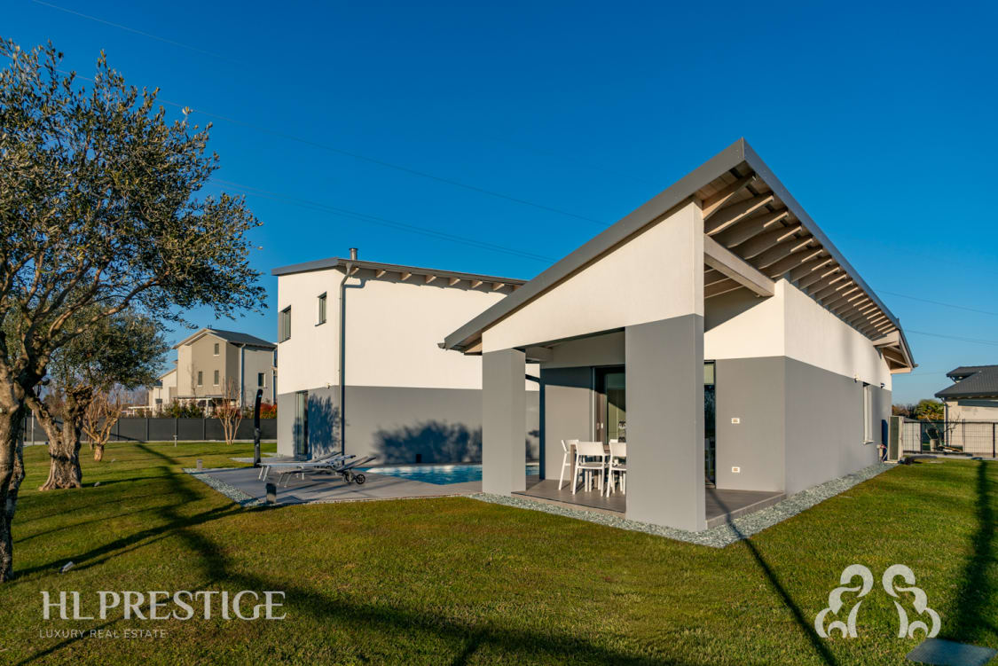 La villa si sviluppa su due livelli, con una distribuzione degli spazi funzionale e ottimizzata per garantire il massimo comfort. Al piano terra si trova un'ampia cucina moderna con affaccio sul giardino e accesso diretto al portico esterno, luogo ideale per pranzare all'aperto nelle giornate più miti.