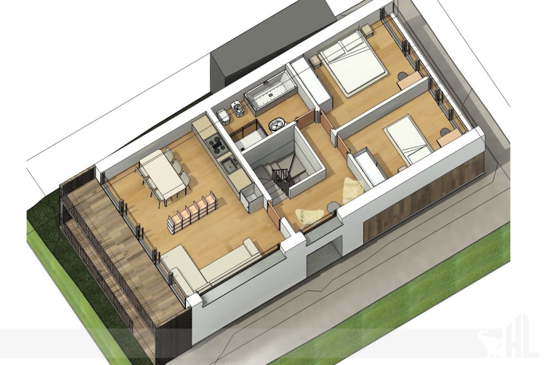 Il primo piano invece, ospiterà una luminosa zona giorno open space con cucina a vista ed area living, due camere da letto ed un secondo bagno, garantendo così una distribuzione razionale e accogliente degli spazi interni.