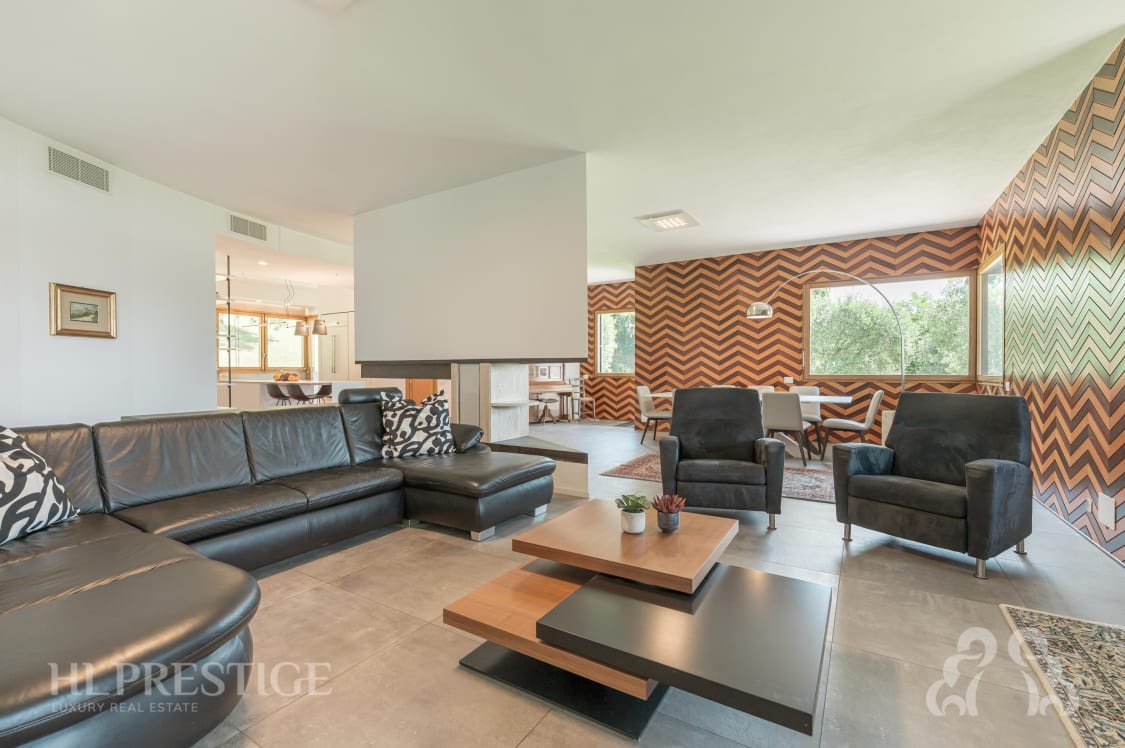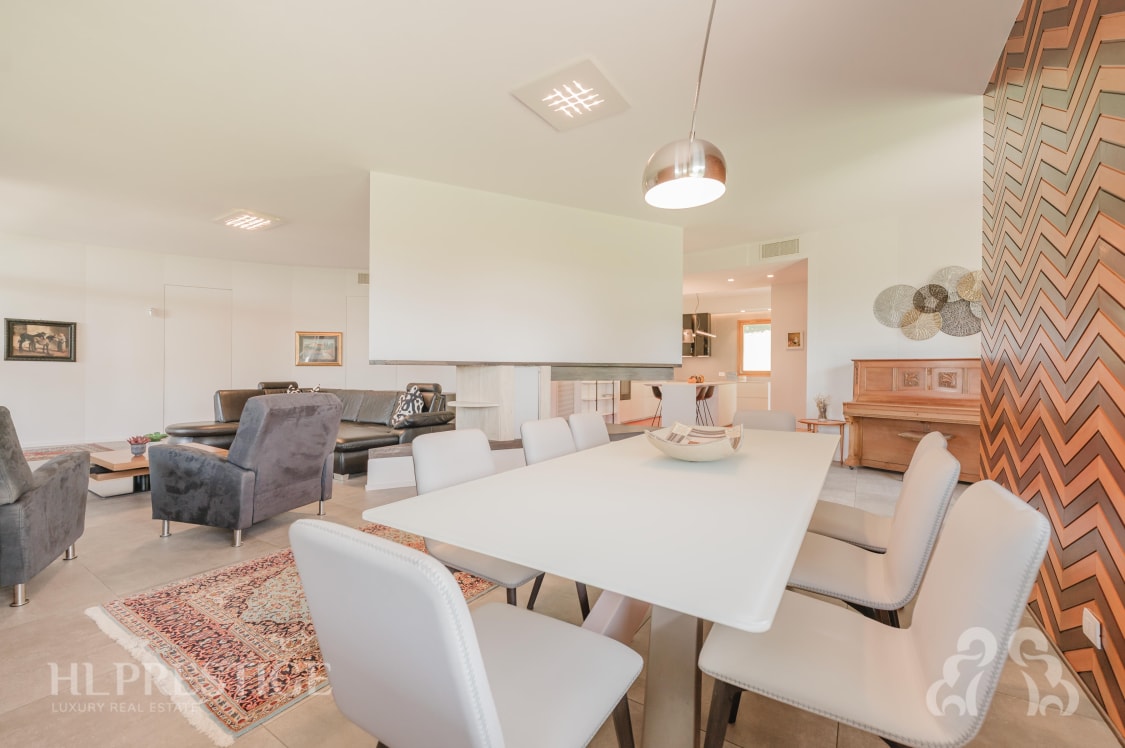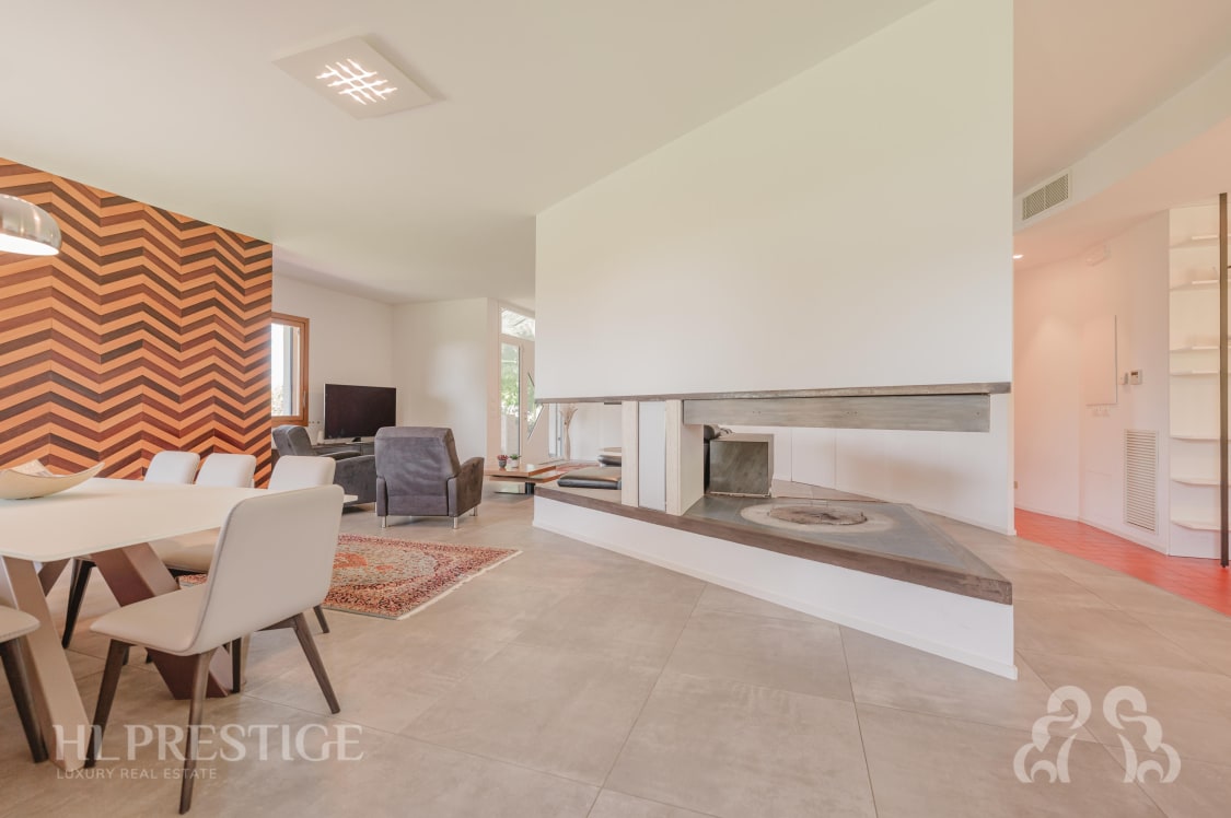 Al piano terra, accedendo alla proprietà, si viene accolti nella bellissima e grande zona living, cuore pulsante della residenza caratterizzata dal caminetto centrale di design, la celebre “lama” di Campioni, che regala forza e distintività all’ambiente donando continuità agli spazi.