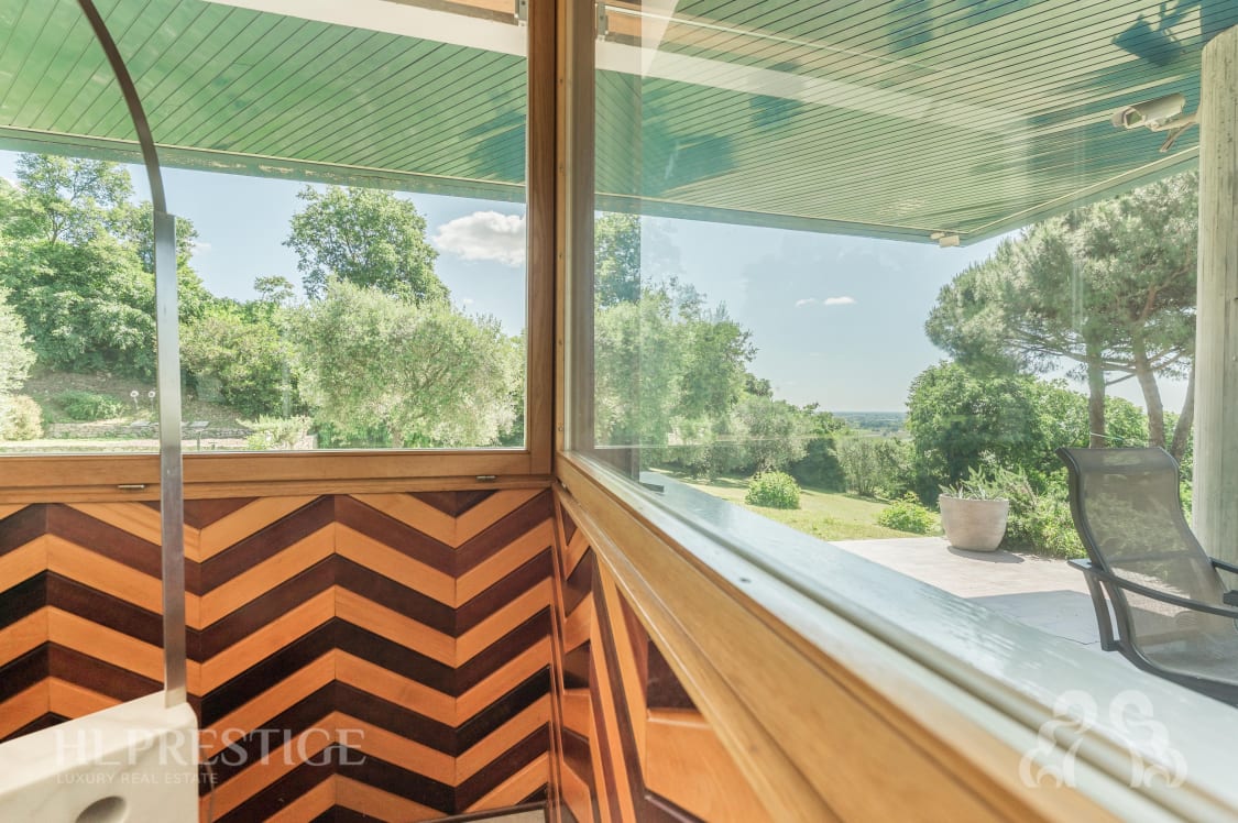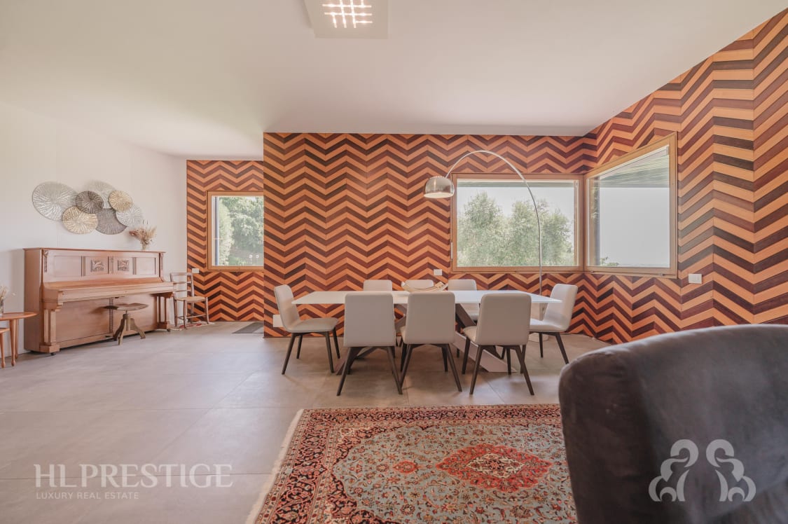 La villa si sviluppa su tre livelli e si inserisce armoniosamente in un terreno di circa 8.000 mq, curato con passione e arricchito da ulivi secolari, alberi da frutto e varietà botaniche selezionate. La villa, gode di una posizione rialzata e di un’ottima esposizione.