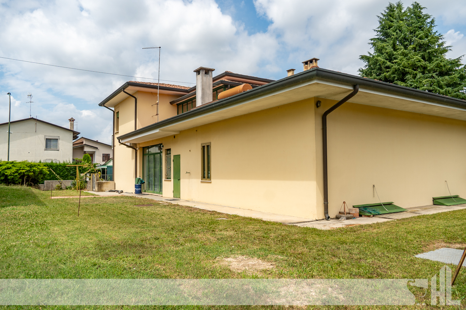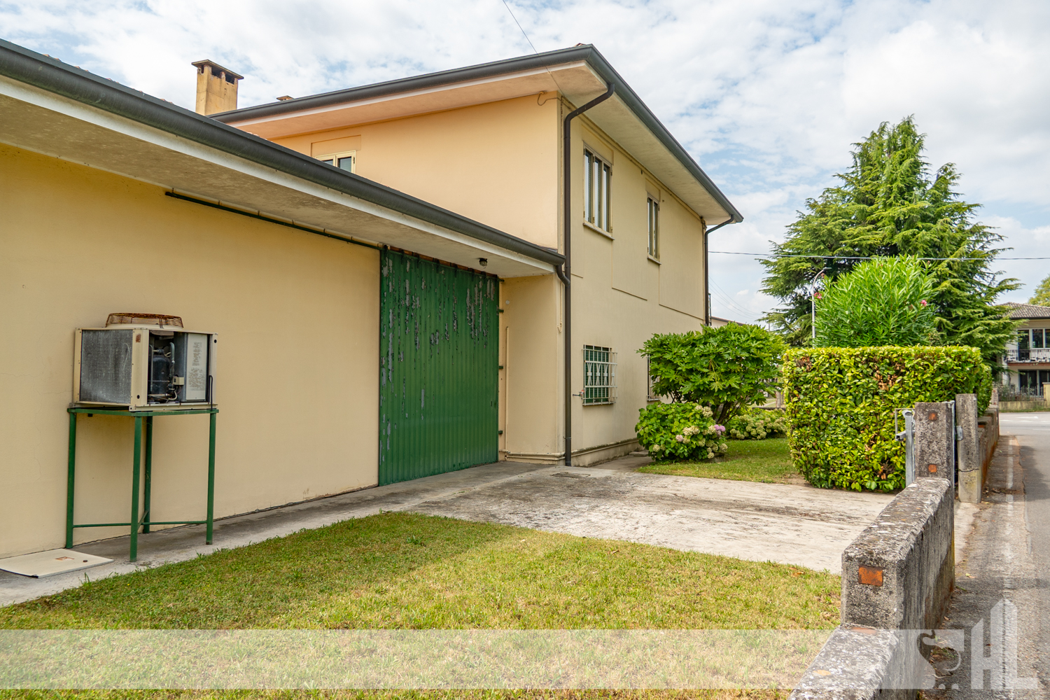 Esternamente, una curata corte privata con area verde circonda l’edificio, offrendo uno spazio all’aperto tranquillo e riservato. Una soluzione perfetta per chi cerca una casa indipendente con spazi extra per attività o magazzino, oppure per chi desidera realizzare più unità abitative in un contesto ben servito.