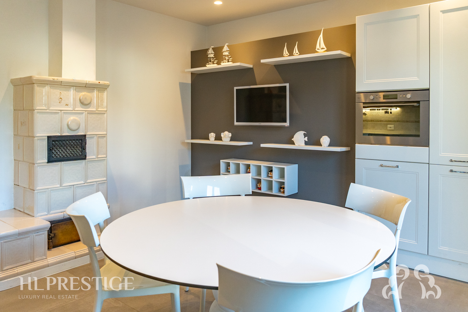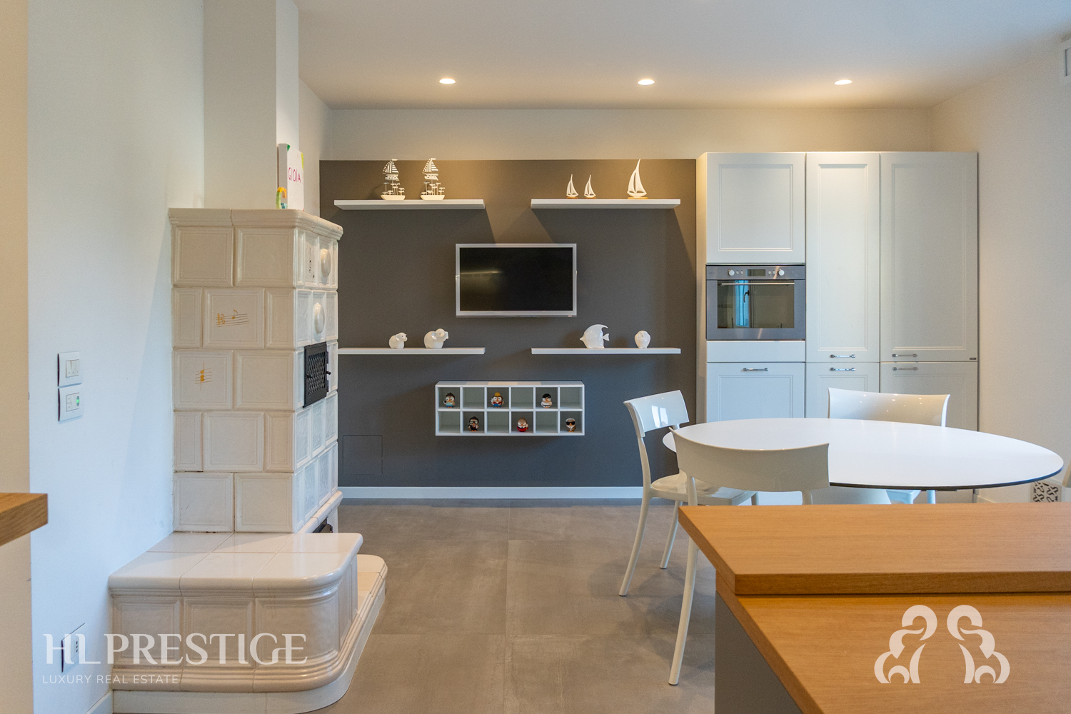 Al piano terra, un ingresso elegante introduce all’ampia zona living dove soggiorno e sala da pranzo si susseguono con naturale armonia, illuminati da grandi aperture che affacciano sul giardino e diffondono luce per tutta la giornata. L’adiacente cucina, moderna e accogliente, è un ambiente perfettamente organizzato per la convivialità quotidiana; qui trova spazio anche una suggestiva stube, capace di diffondere un calore avvolgente e dare carattere all’intera casa.