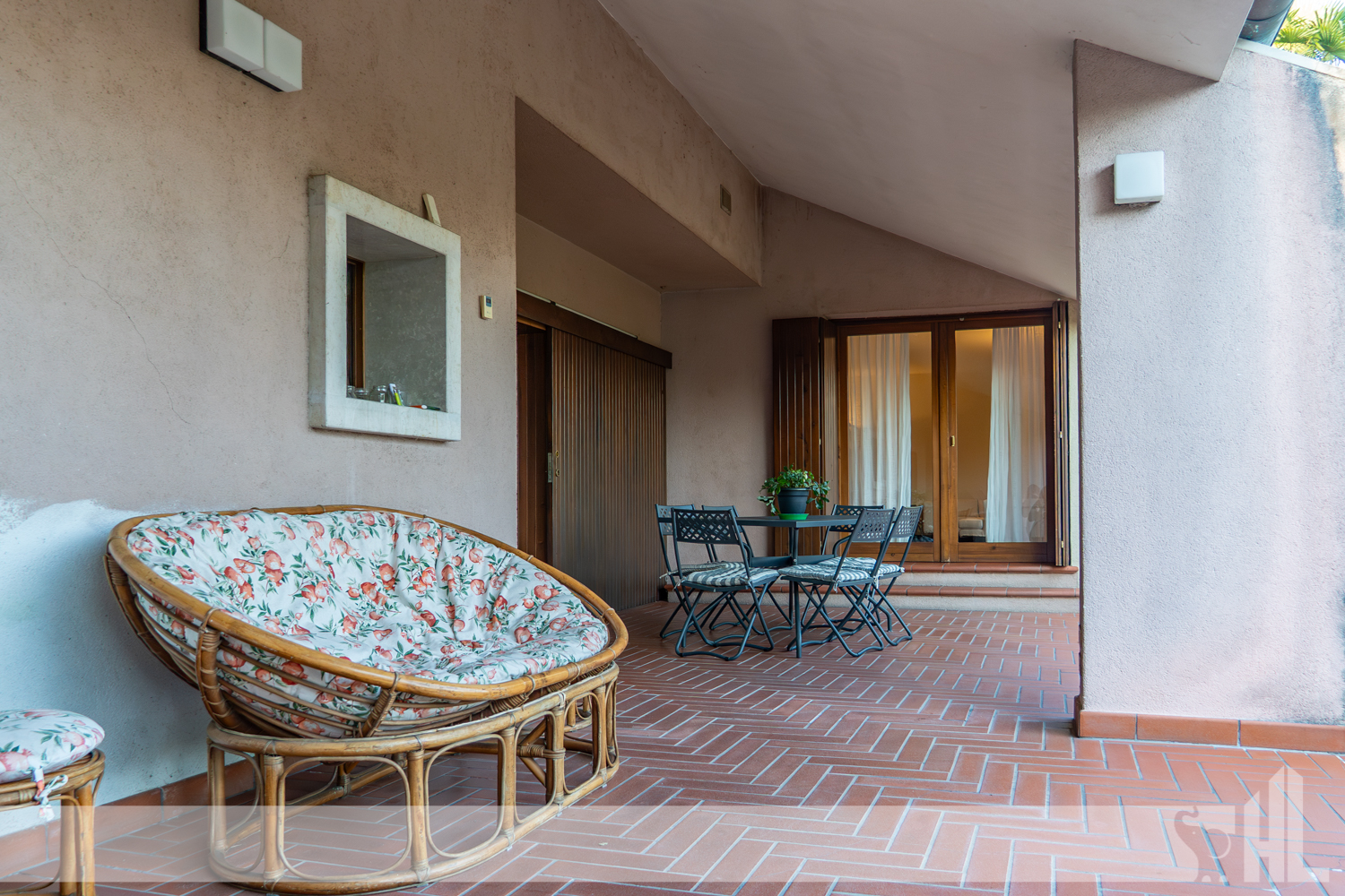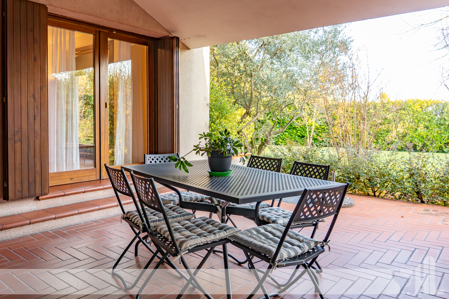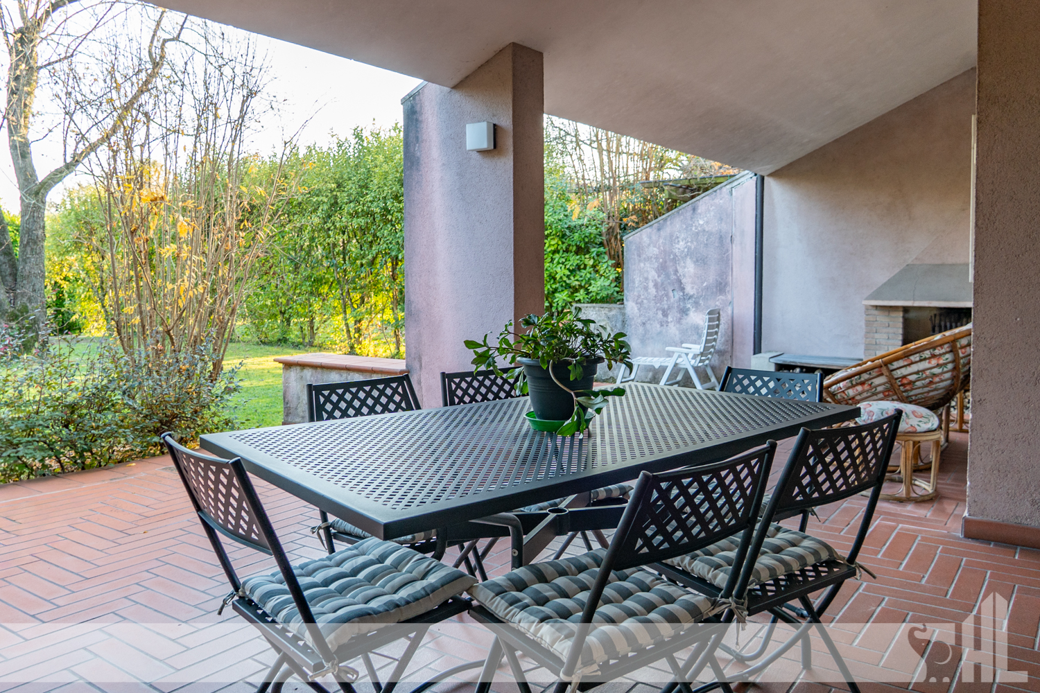 Esternamente, il giardino di oltre 1.200 mq, i portici vivibili e la struttura dell’immobile creano un insieme armonioso che amplifica la sensazione di benessere.