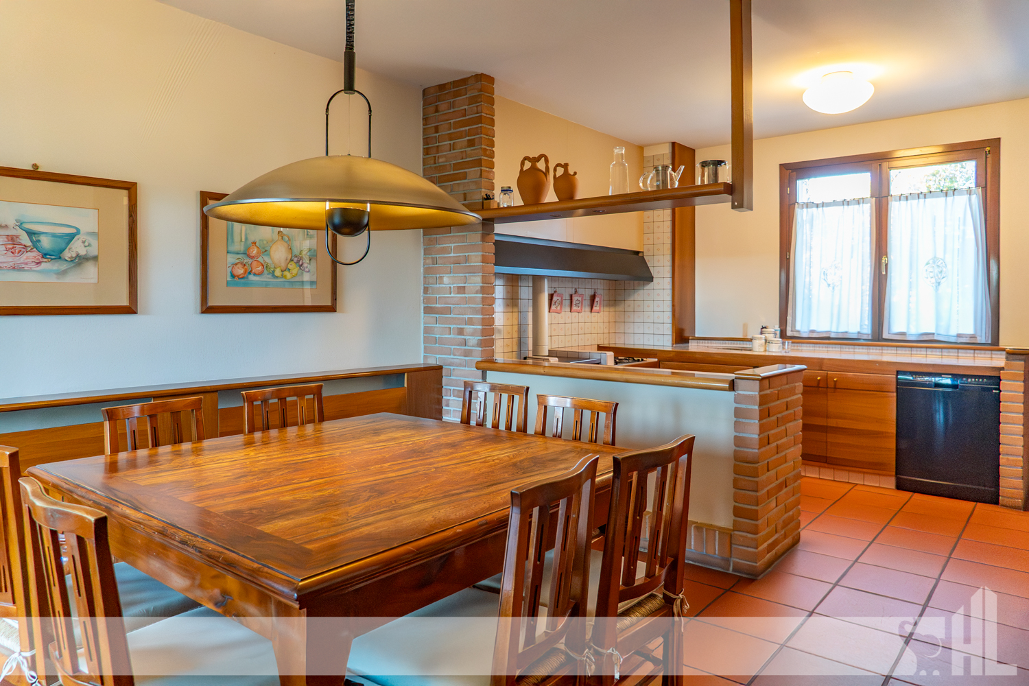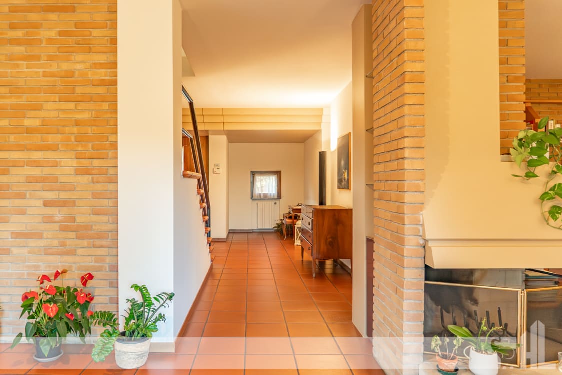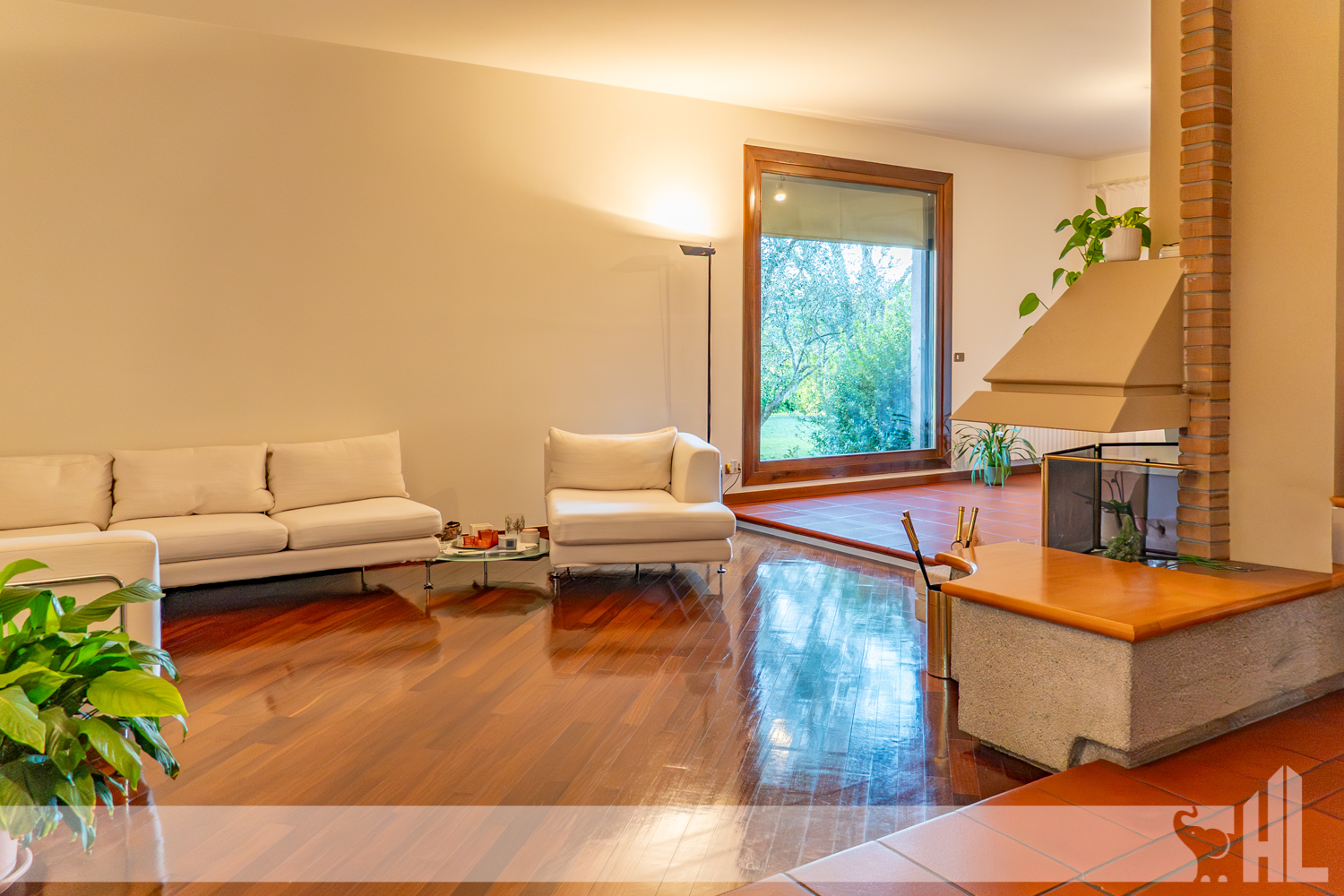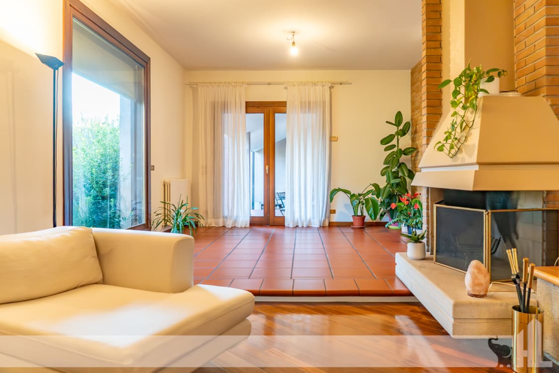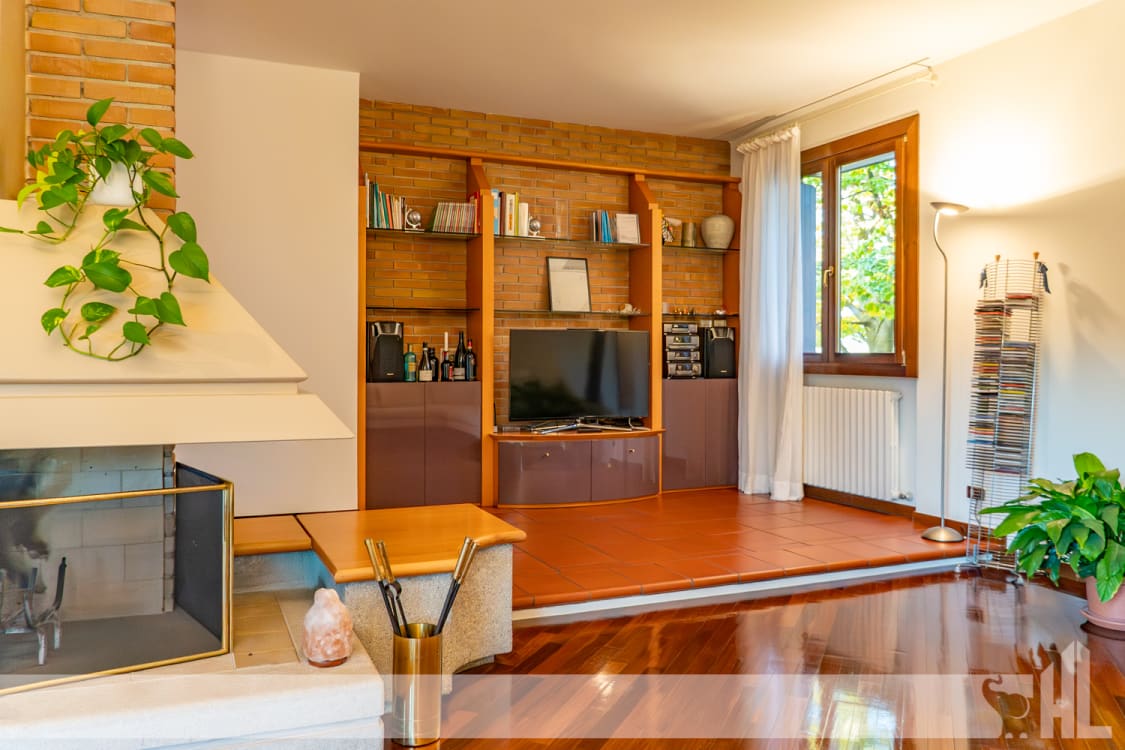 Al piano terra, un ingresso accogliente introduce al grande living con camino centrale, autentico fulcro della casa. Qui soggiorno e sala da pranzo si aprono attraverso ampie superfici vetrate sul verde del giardino, creando un dialogo costante con la natura. I pavimenti in cotto donano calore e carattere all’intera zona giorno.