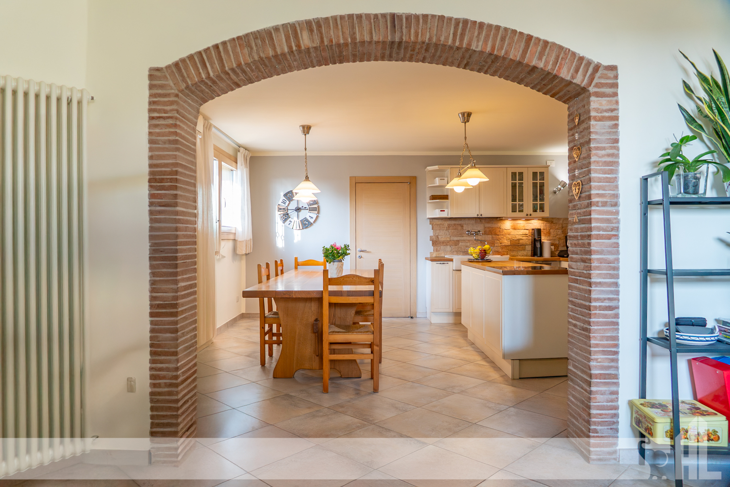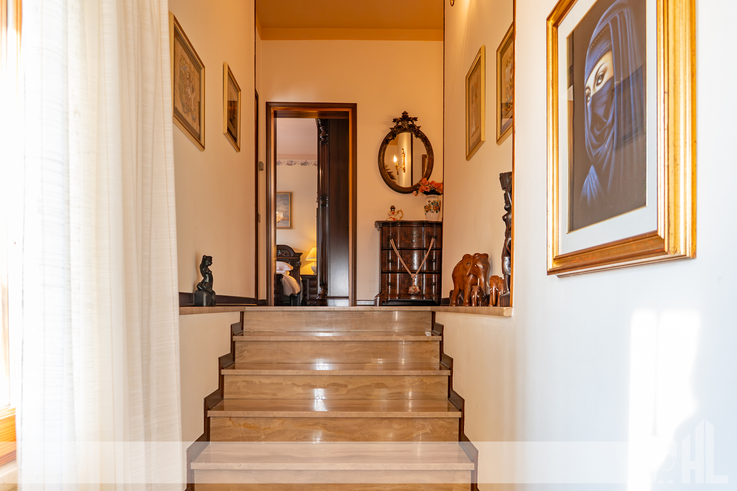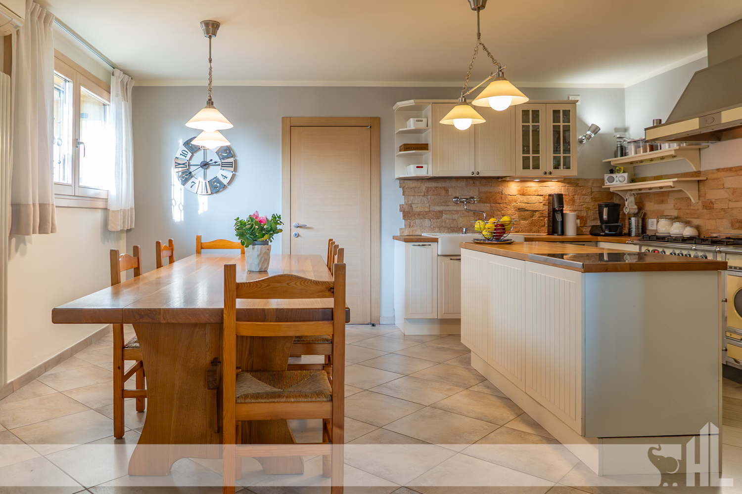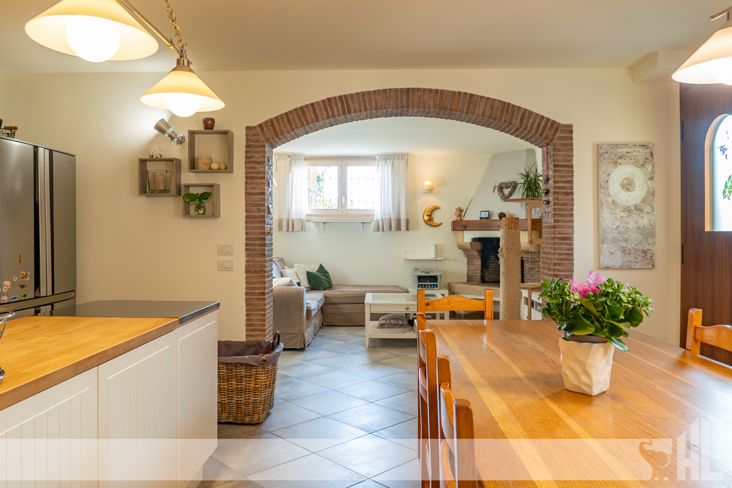 La villa si sviluppa interamente su due livelli, offrendo metrature generose e una distribuzione degli spazi funzionale e raffinata. Al piano rialzato si apre l’abitazione principale, l’ingresso accoglie con un ambiente ampio e pratico che conduce alla cucina spaziosa, collegata al soggiorno. Qui, le grandi vetrate e la luce naturale creano un’atmosfera calda e conviviale, il vero cuore della casa. La zona notte comprende un bagno finestrato e tre camere da letto di ottime dimensioni, di cui una con bagno en suite.