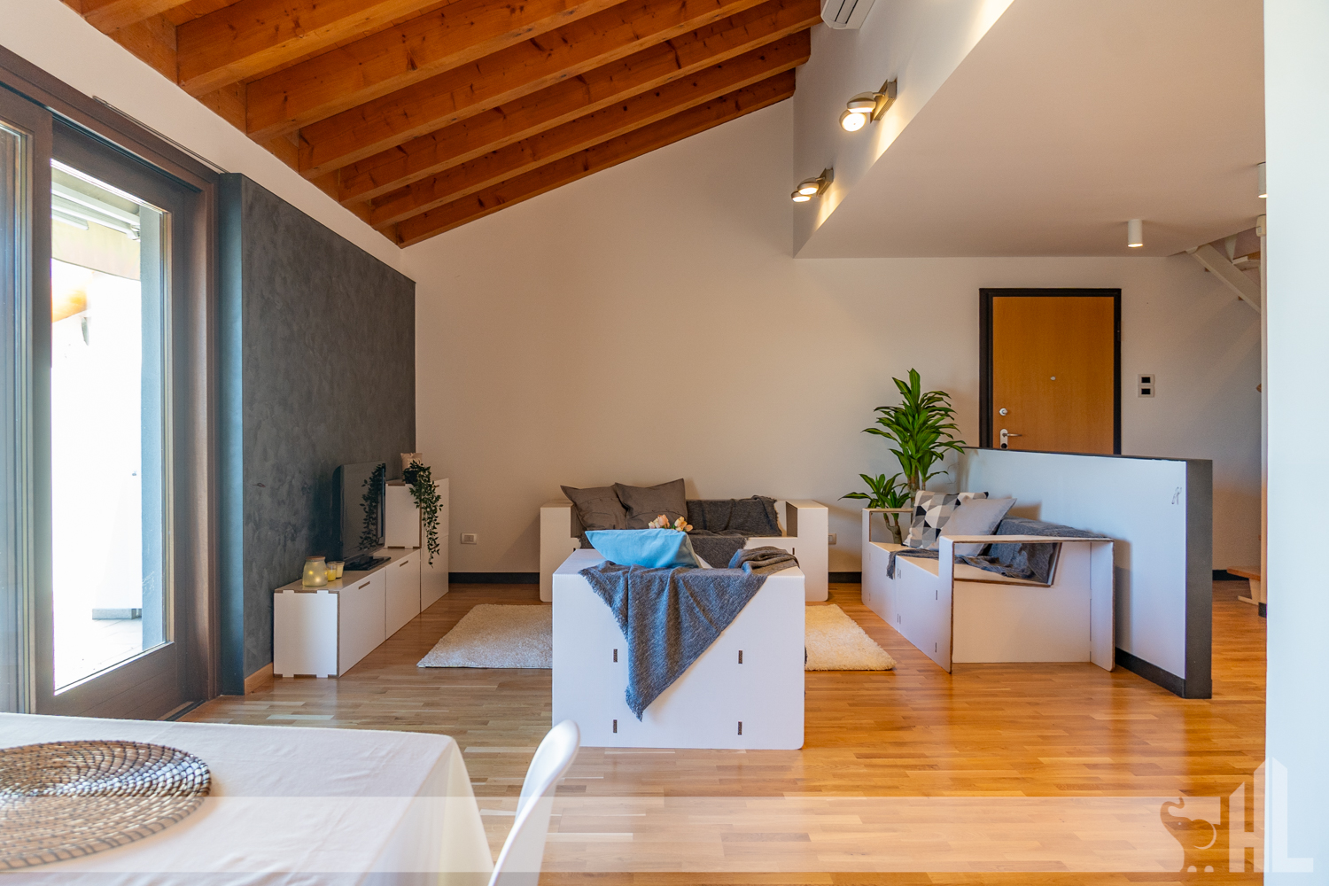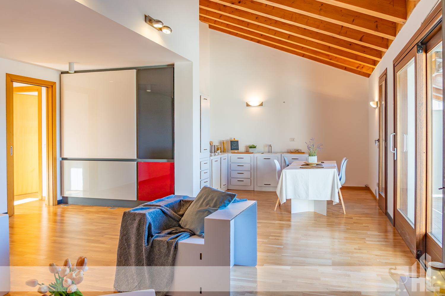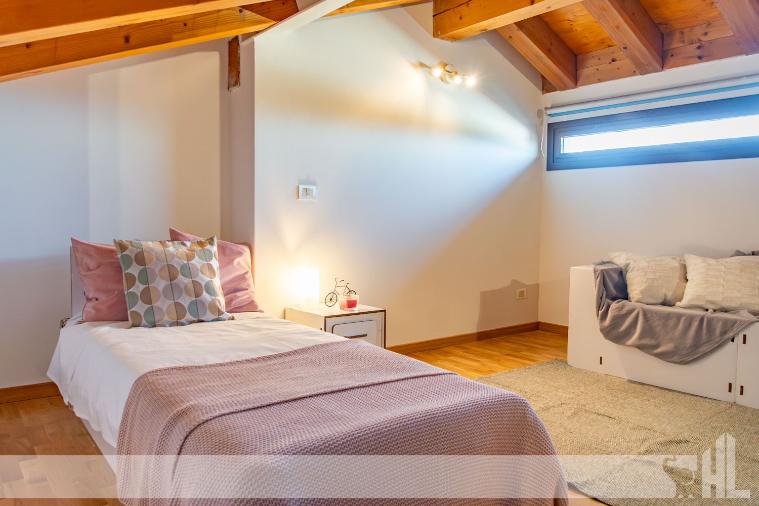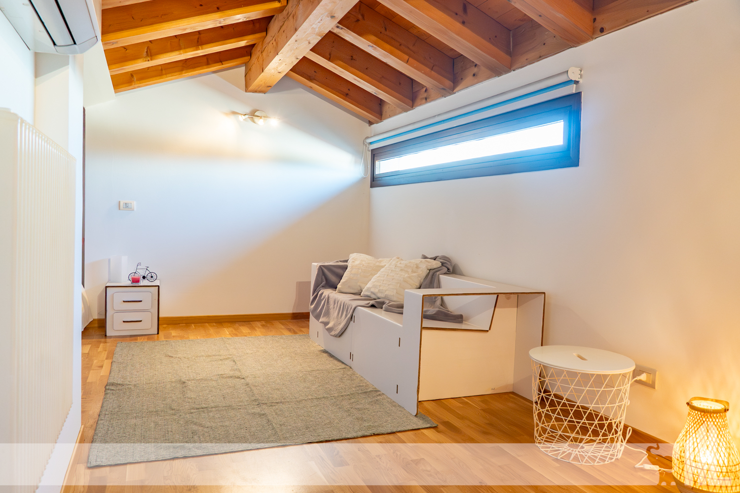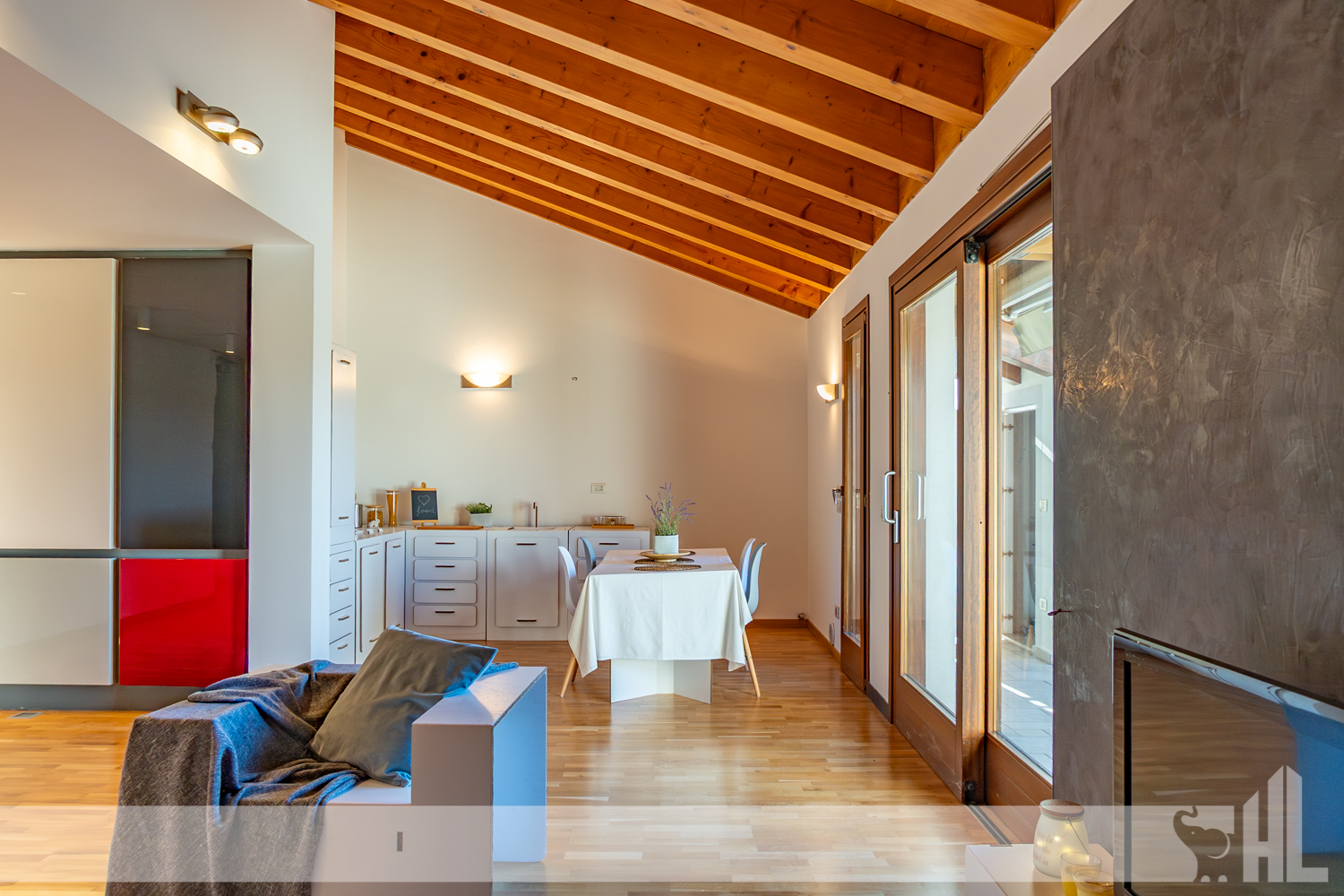 Entrando, l’occhio viene subito catturato dalla zona giorno open space, ampia, ariosa e luminosissima, valorizzata da una grande vetrata che accompagna al terrazzo principale: uno spazio davvero generoso, vivibile come un salotto all’aperto, con in più la presenza della canna fumaria per chi sogna un caminetto o una stufa. La zona notte è composta da una camera matrimoniale con bagno finestrato en suite e accesso diretto al secondo terrazzo, una camera singola, una stanza jolly perfetta come studio o terza camera, e un secondo bagno. Dalla zona living si sale al soppalco mansardato, un plus rarissimo da adibire a relax, home office o spazio ospiti.
