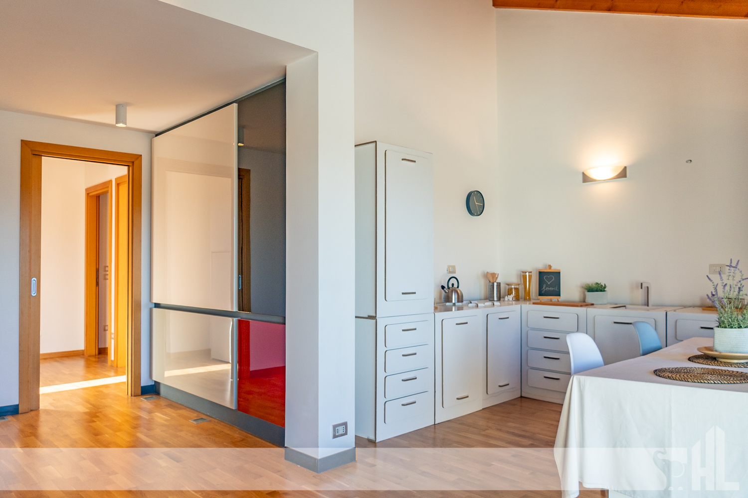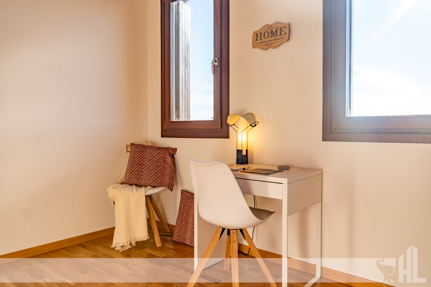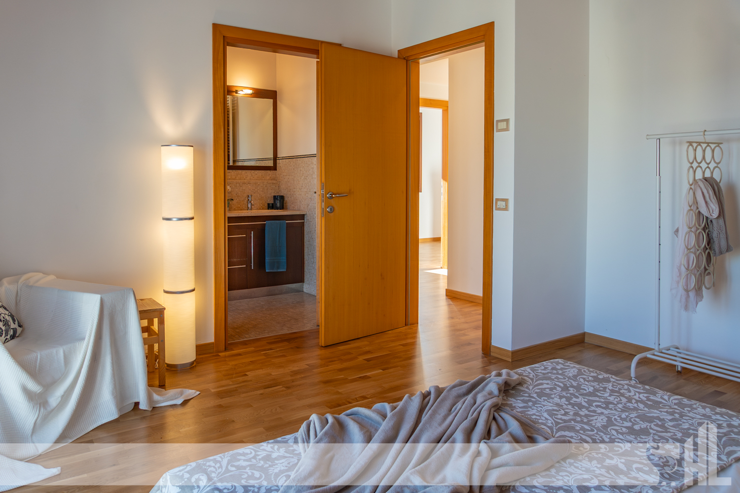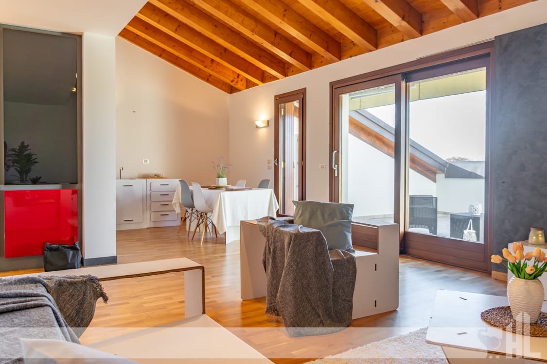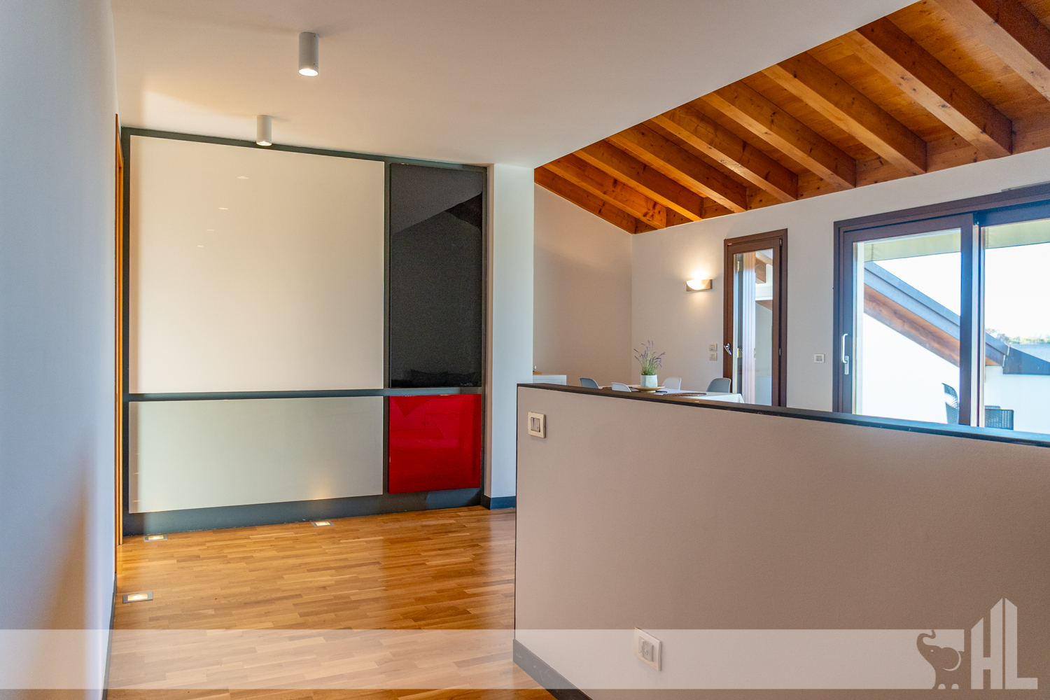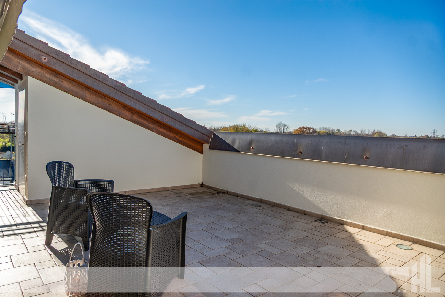 Entrando, l’occhio viene subito catturato dalla zona giorno open space, ampia, ariosa e luminosissima, valorizzata da una grande vetrata che accompagna al terrazzo principale: uno spazio davvero generoso, vivibile come un salotto all’aperto, con in più la presenza della canna fumaria per chi sogna un caminetto o una stufa. La zona notte è composta da una camera matrimoniale con bagno finestrato en suite e accesso diretto al secondo terrazzo, una camera singola, una stanza jolly perfetta come studio o terza camera, e un secondo bagno. Dalla zona living si sale al soppalco mansardato, un plus rarissimo da adibire a relax, home office o spazio ospiti.