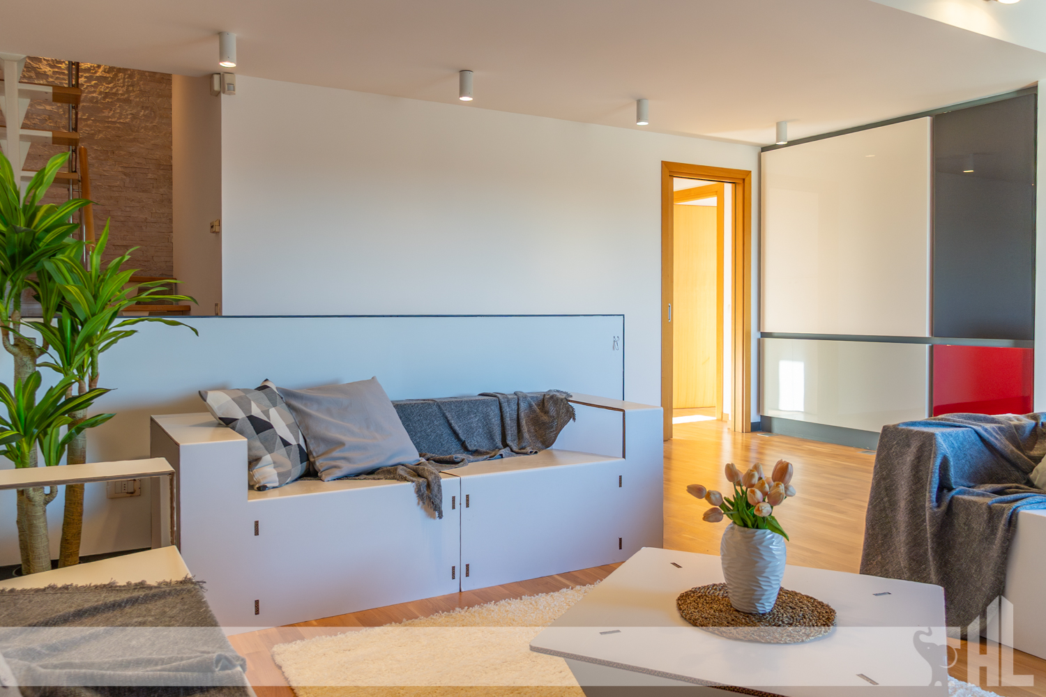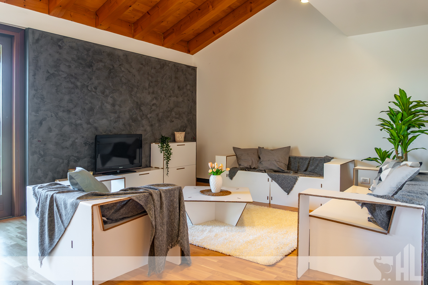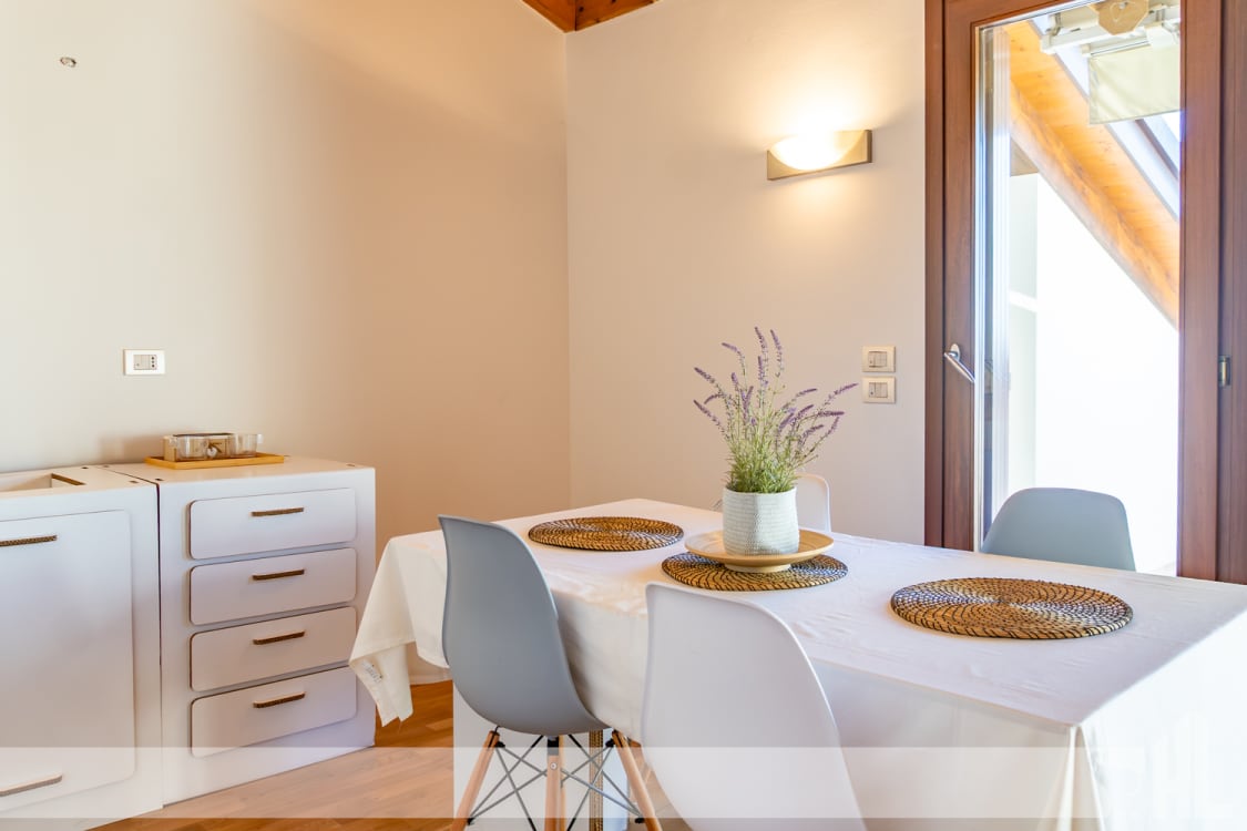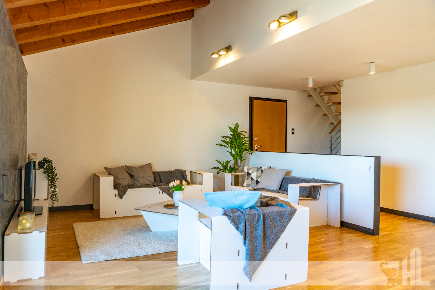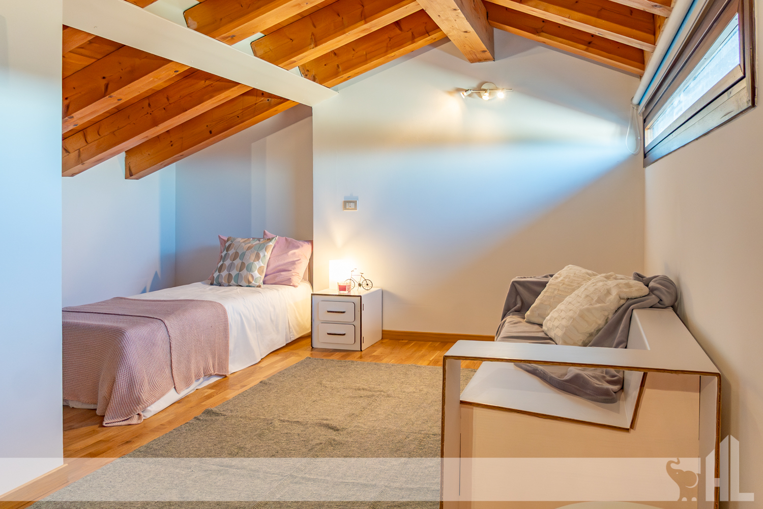 Entrando, l’occhio viene subito catturato dalla zona giorno open space, ampia, ariosa e luminosissima, valorizzata da una grande vetrata che accompagna al terrazzo principale: uno spazio davvero generoso, vivibile come un salotto all’aperto, con in più la presenza della canna fumaria per chi sogna un caminetto o una stufa. La zona notte è composta da una camera matrimoniale con bagno finestrato en suite e accesso diretto al secondo terrazzo, una camera singola, una stanza jolly perfetta come studio o terza camera, e un secondo bagno. Dalla zona living si sale al soppalco mansardato, un plus rarissimo da adibire a relax, home office o spazio ospiti.