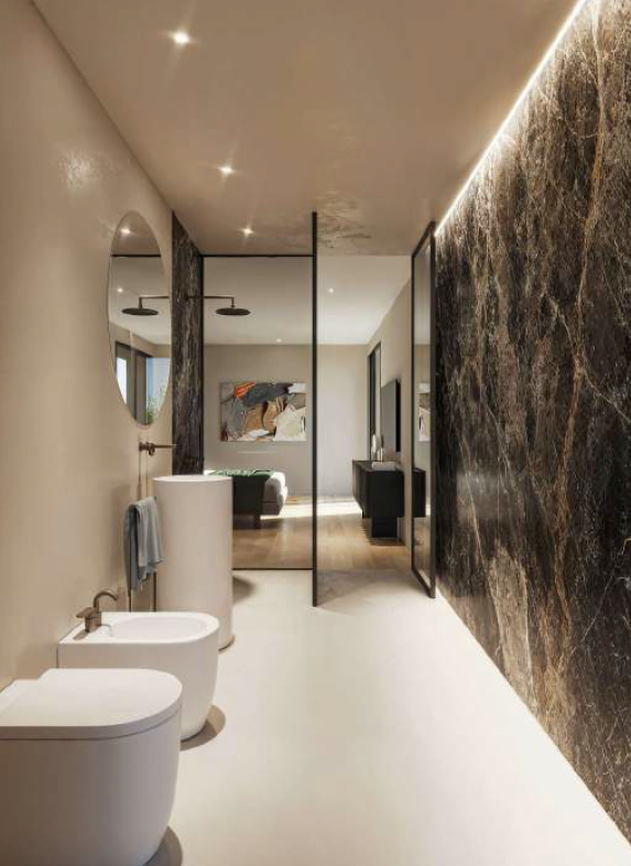 La villa si sviluppa su due livelli e offre ambienti ampi, luminosi e ben distribuiti. Al piano terra troviamo una grande zona giorno open space, accogliente e versatile, valorizzata da ampie vetrate che garantiscono luce naturale per tutto il giorno. Completano il piano un antibagno con bagno finestrato e doccia, una comoda lavanderia collegata direttamente al garage doppio. Salendo al primo piano si accede alla zona notte, composta da una camera singola e due camere matrimoniali, una con bagno en suite, l’altra con cabina armadio, ed entrambe con accesso privato alle terrazze. Un terzo bagno e un balcone completano il livello.