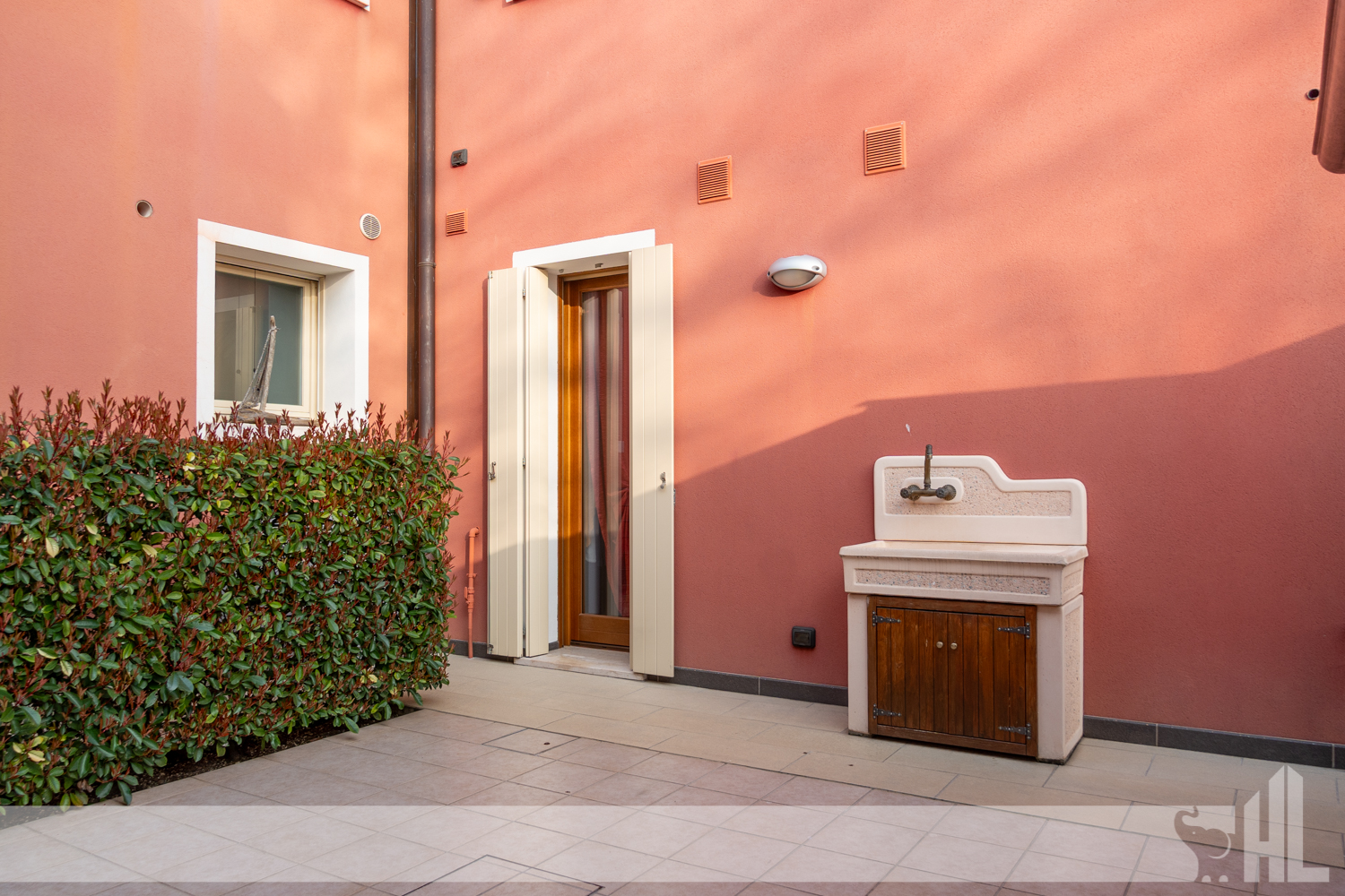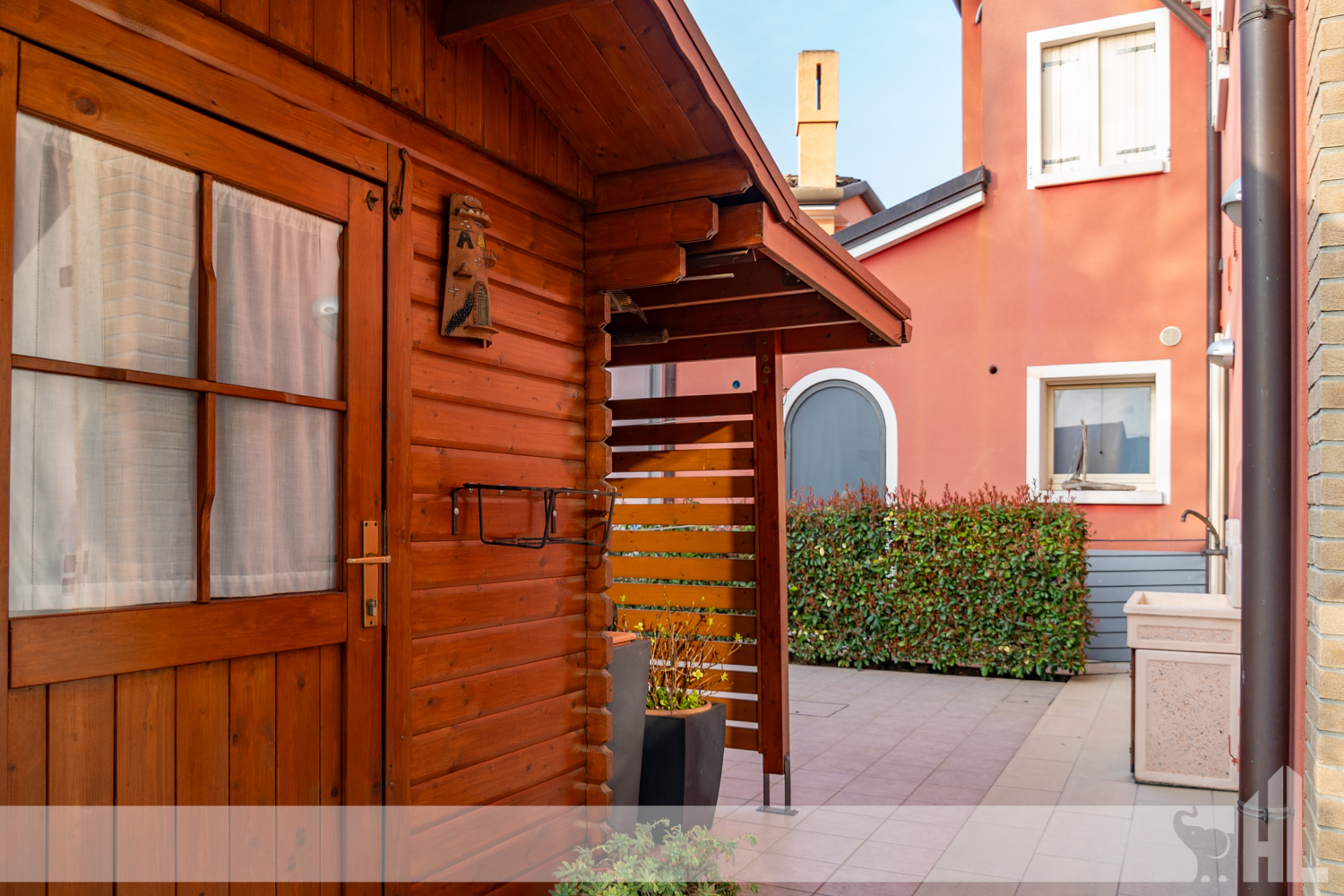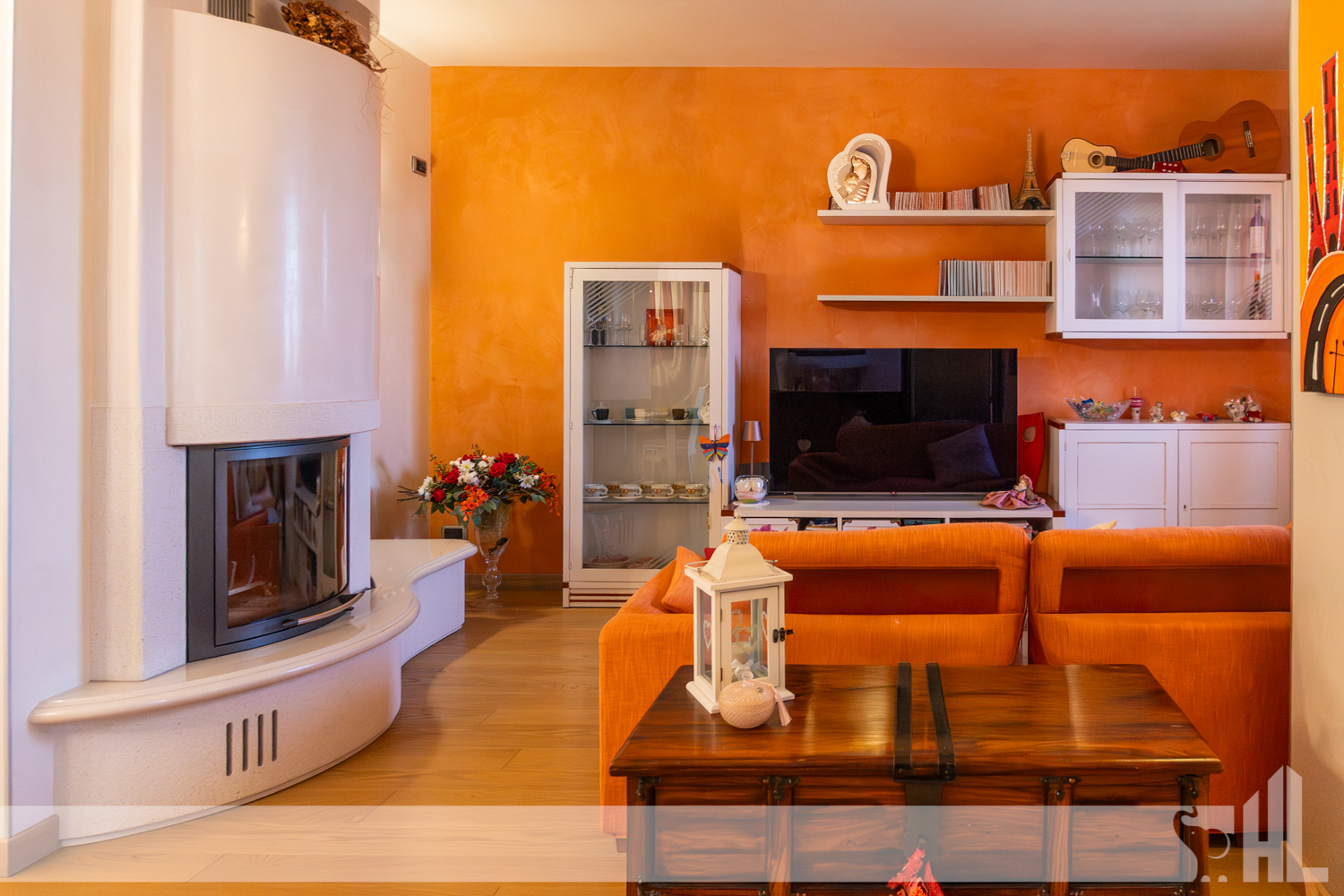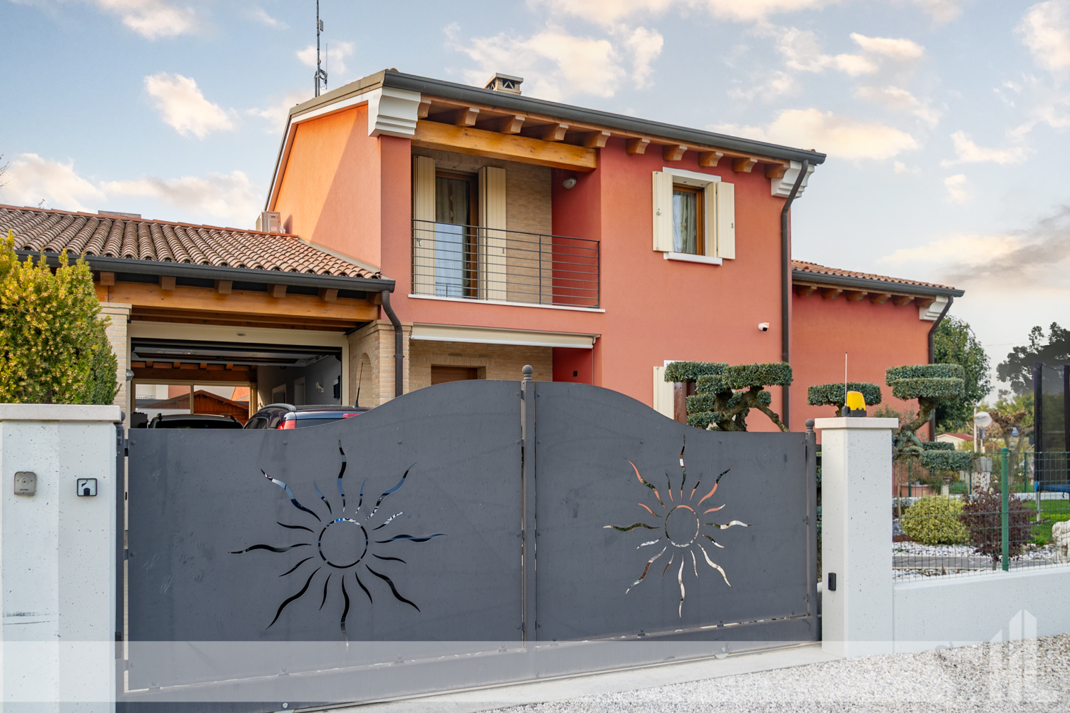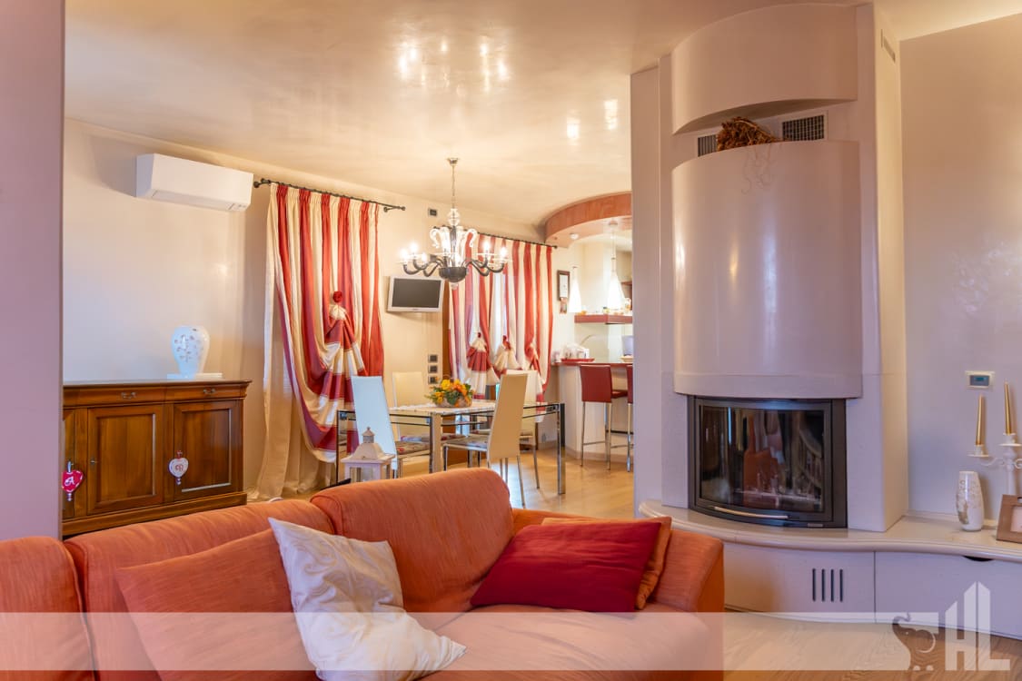L’ingresso è valorizzato da un elegante vialetto curato che conduce alla loggia coperta, creando una piacevole continuità tra gli spazi esterni e l’interno della casa. Il soggiorno rappresenta il cuore dell’abitazione: un ambiente accogliente impreziosito da un suggestivo caminetto a legna, perfetto per momenti di relax e convivialità.