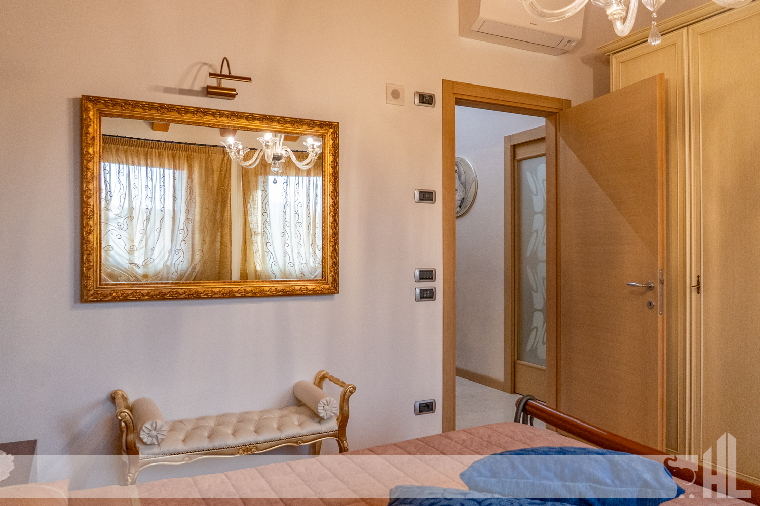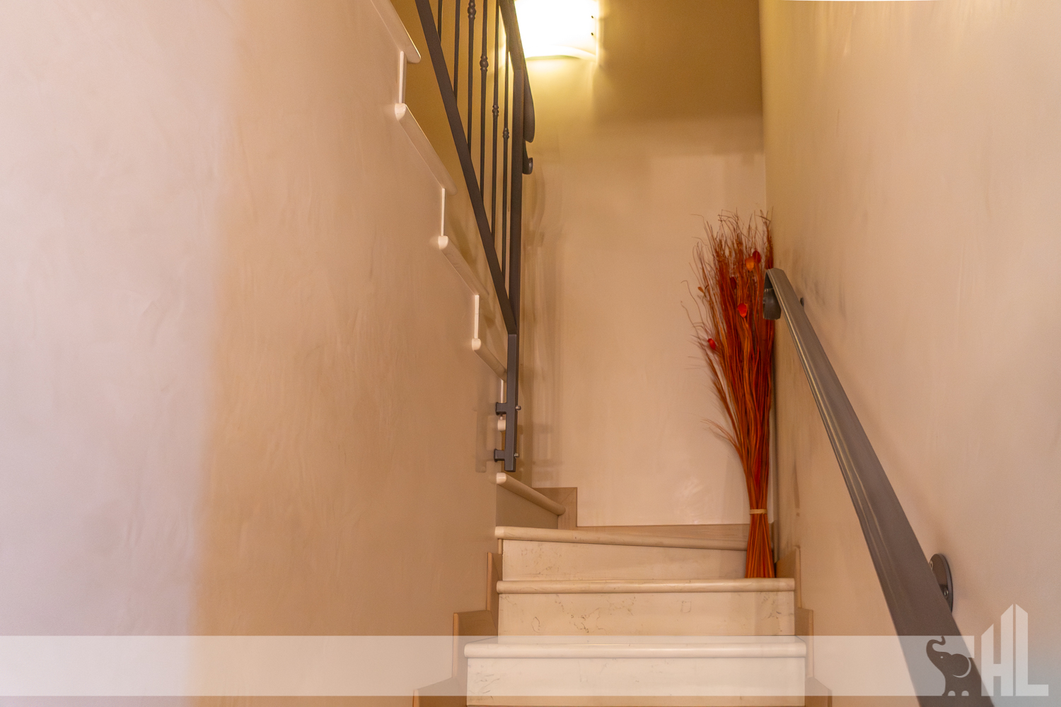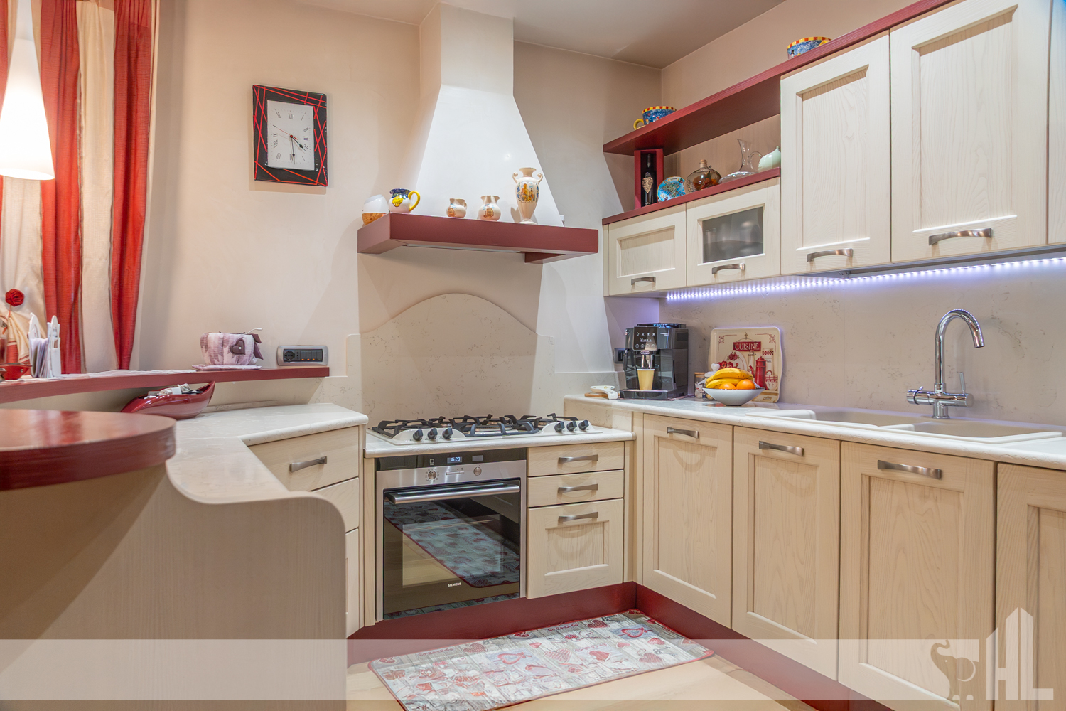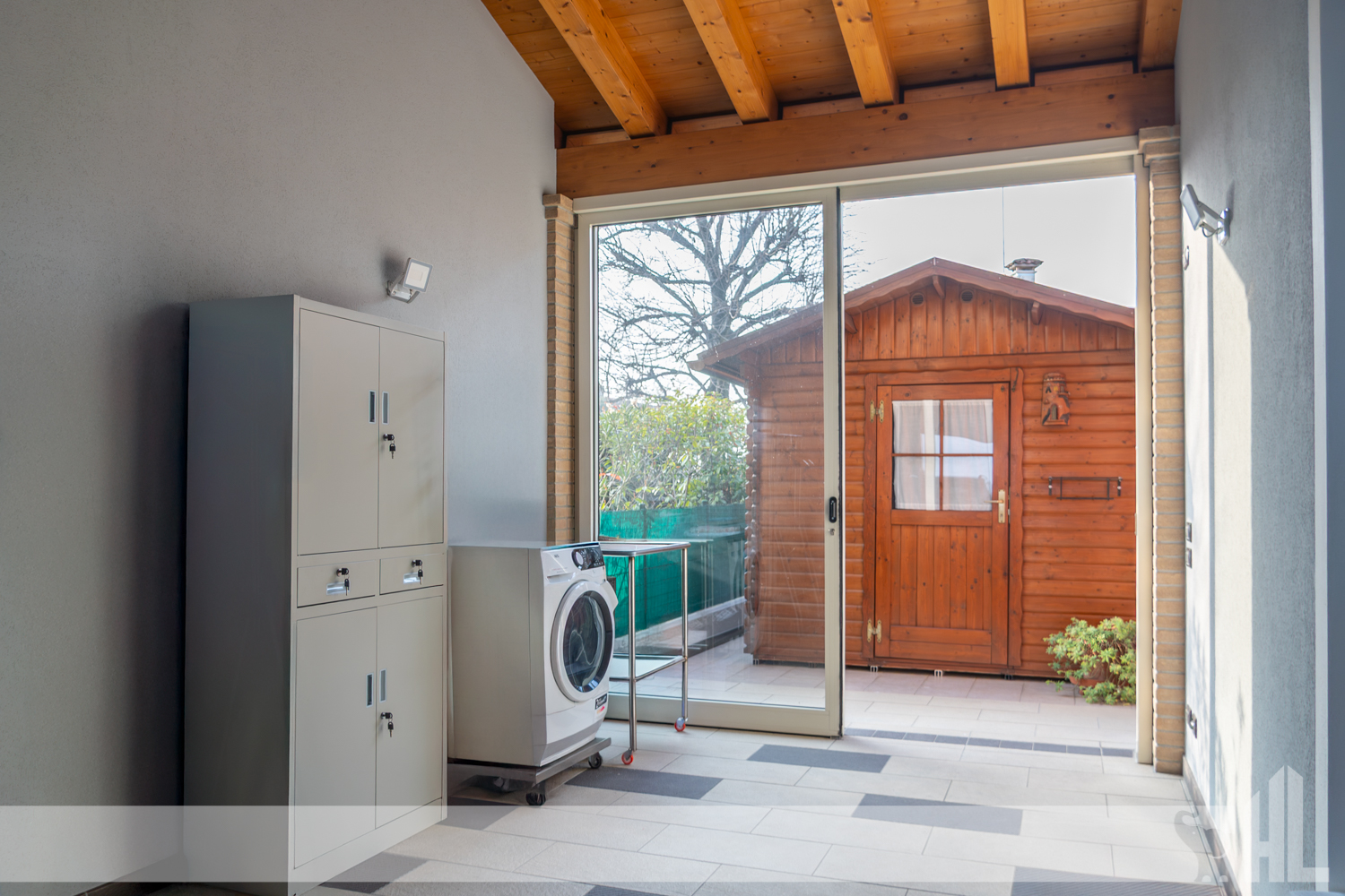 L’ingresso è valorizzato da un elegante vialetto curato che conduce alla loggia coperta, creando una piacevole continuità tra gli spazi esterni e l’interno della casa. Il soggiorno rappresenta il cuore dell’abitazione: un ambiente accogliente impreziosito da un suggestivo caminetto a legna, perfetto per momenti di relax e convivialità.