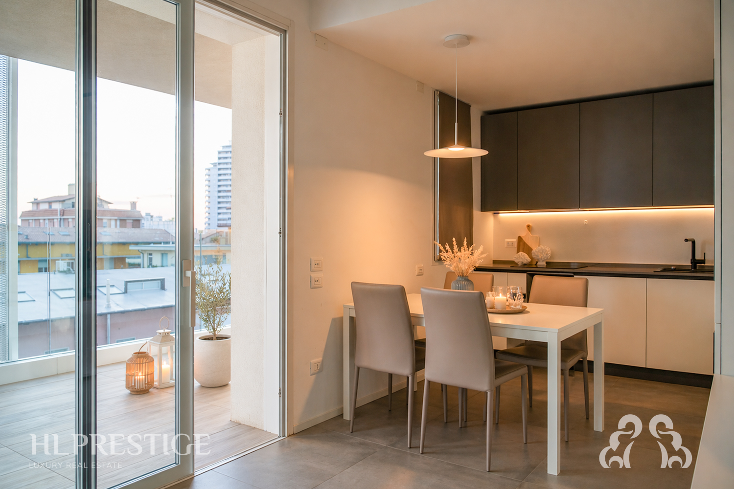 La zona living accoglie con un’atmosfera calda e raffinata. Le tonalità neutre, i dettagli curati e la luce che filtra dalle ampie aperture creano un ambiente armonioso e accogliente. La continuità tra interno ed esterno è uno degli elementi distintivi: il grande terrazzo abitabile si apre come un’estensione naturale della casa.